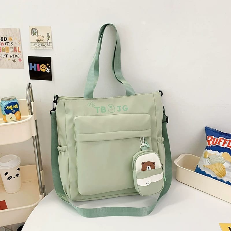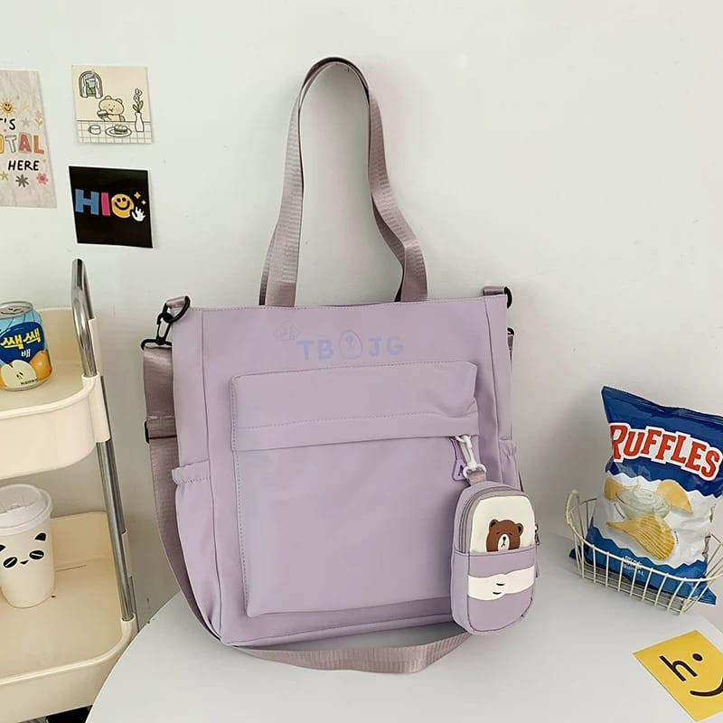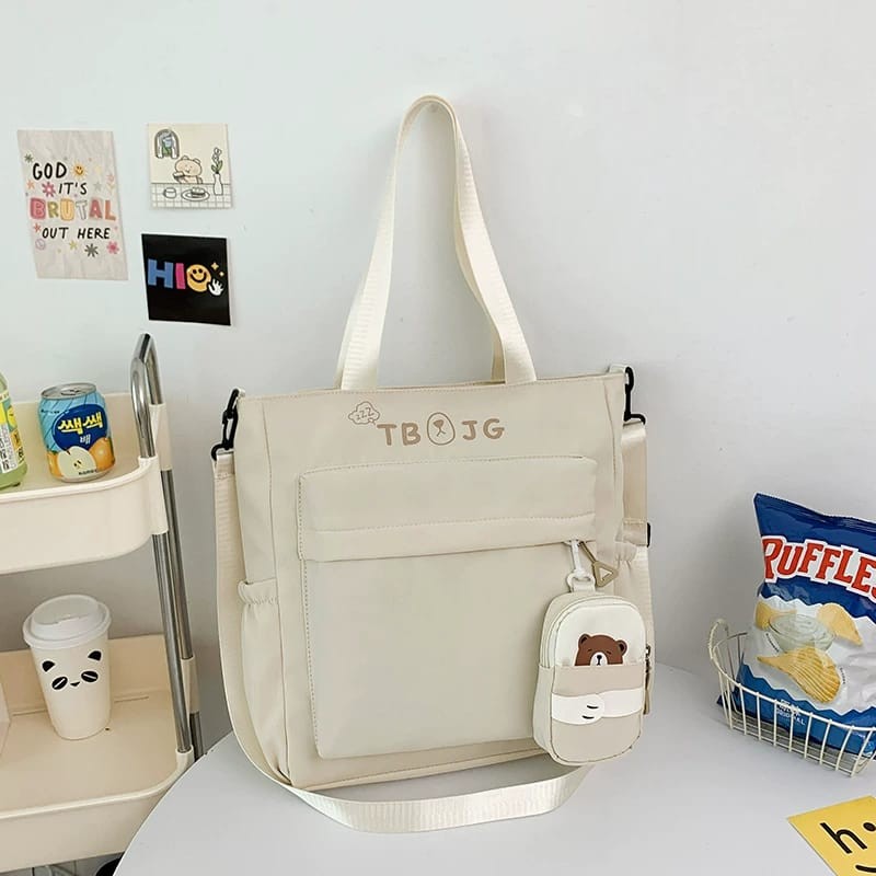 Elevate your everyday style with this elegant beige canvas tote bag, crafted for both versatility and convenience. Featuring generous compartments and a secure front pocket, it keeps your essentials organized for school, work, or leisurely outings. A whimsical cartoon accessory case adds a playful touch and extra storage for smaller items. With sturdy handles and a spacious interior, this tote blends practicality with charm—perfect for busy days on the go. Dimensions: 40 cm x 35 cm x 14 cm. Available in classic beige to complement any outfit.