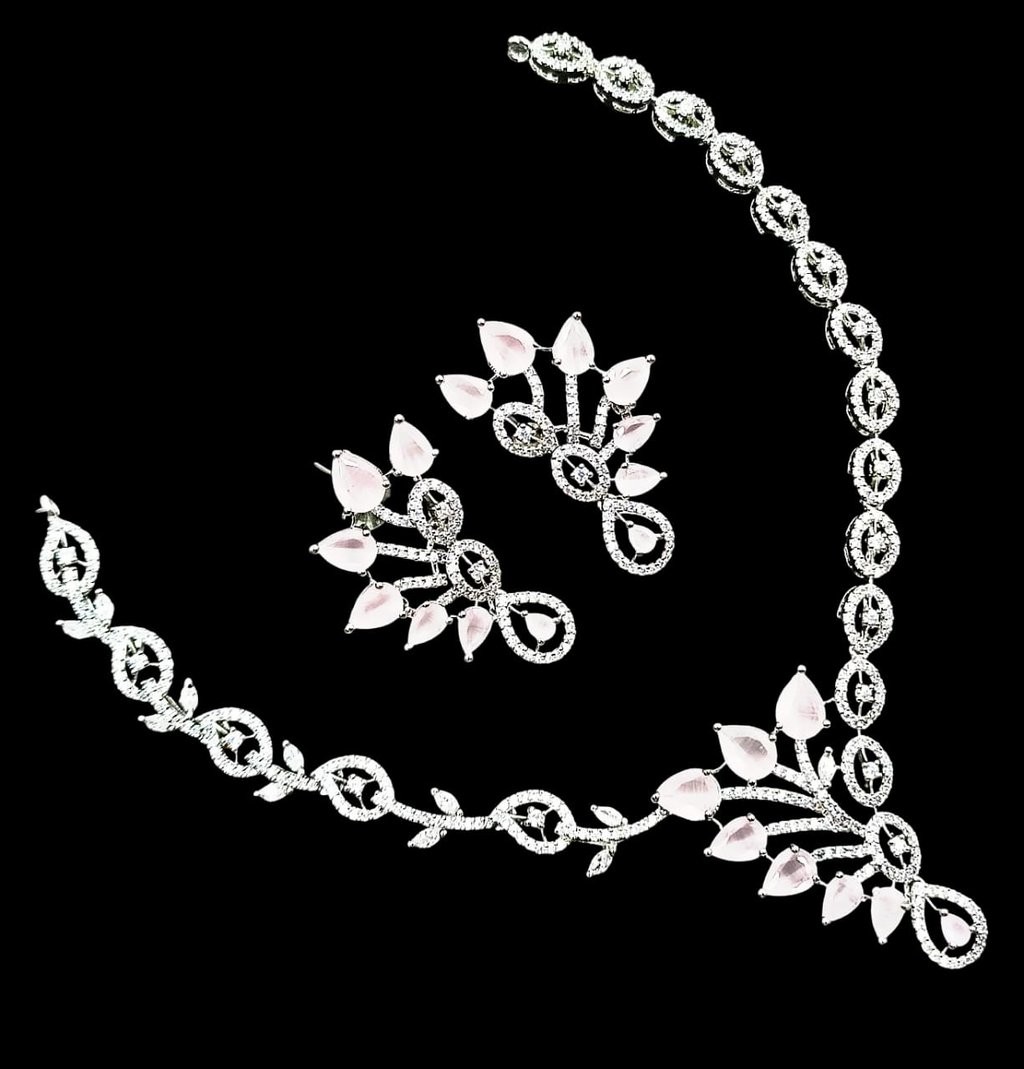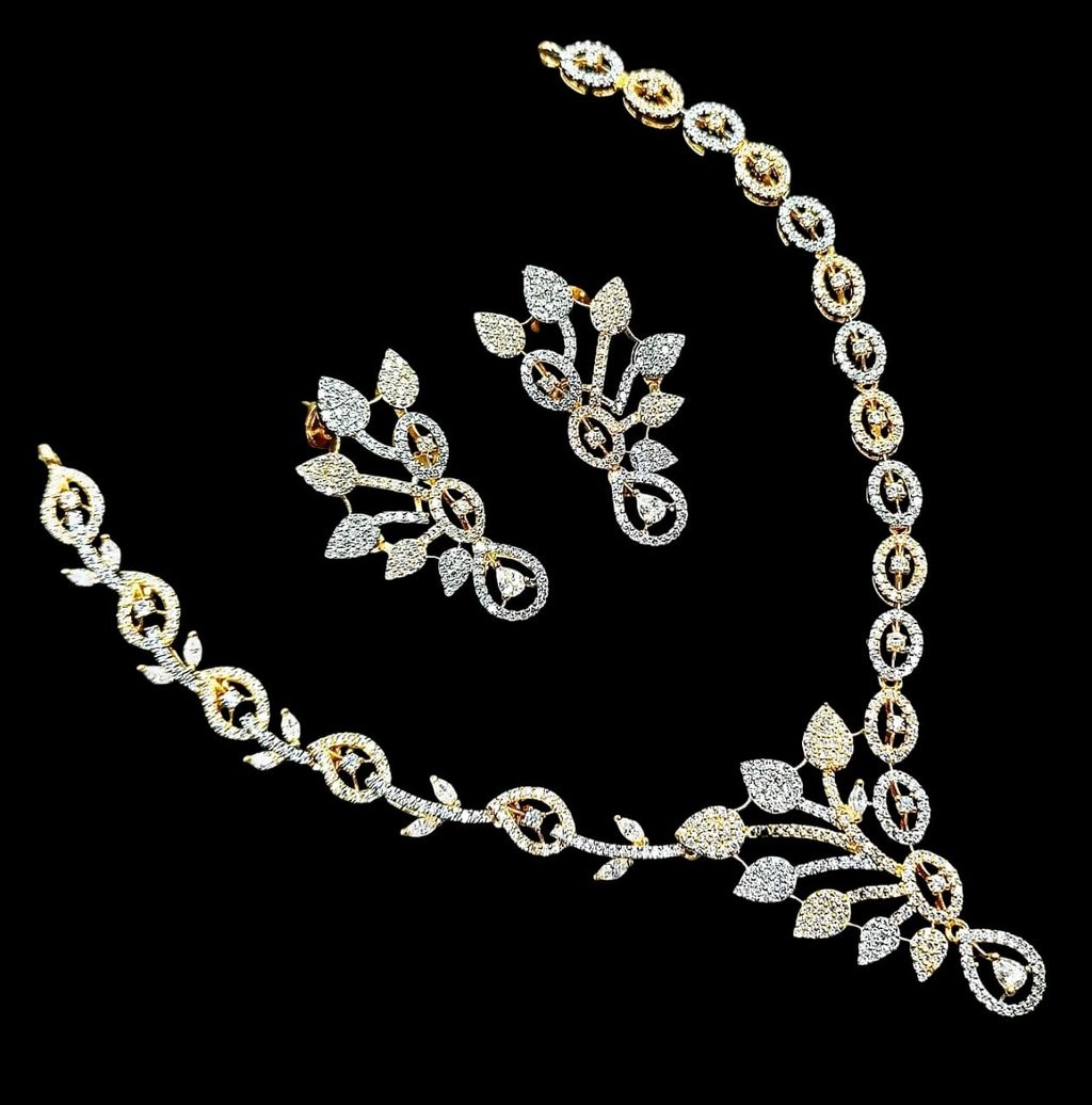 Elevate your style with this stunning silver jewelry set, featuring a delicately handcrafted necklace and matching earrings. Each piece showcases intricate leaf motifs adorned with sparkling stones, reflecting timeless elegance and exceptional craftsmanship. The set makes a perfect accessory for weddings, parties, or simply adding a touch of sophisticated glamour to your everyday look. Necklace length: 18 inches. Earrings: 1.5 inches drop. Color: lustrous silver with clear stones. Treat yourself or gift someone special—this set comes beautifully packaged, ready for any occasion.