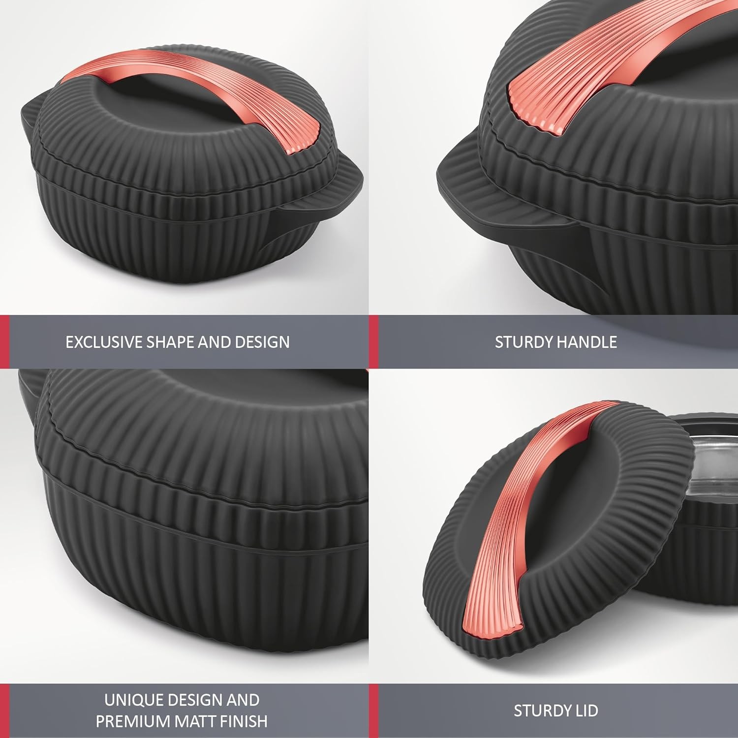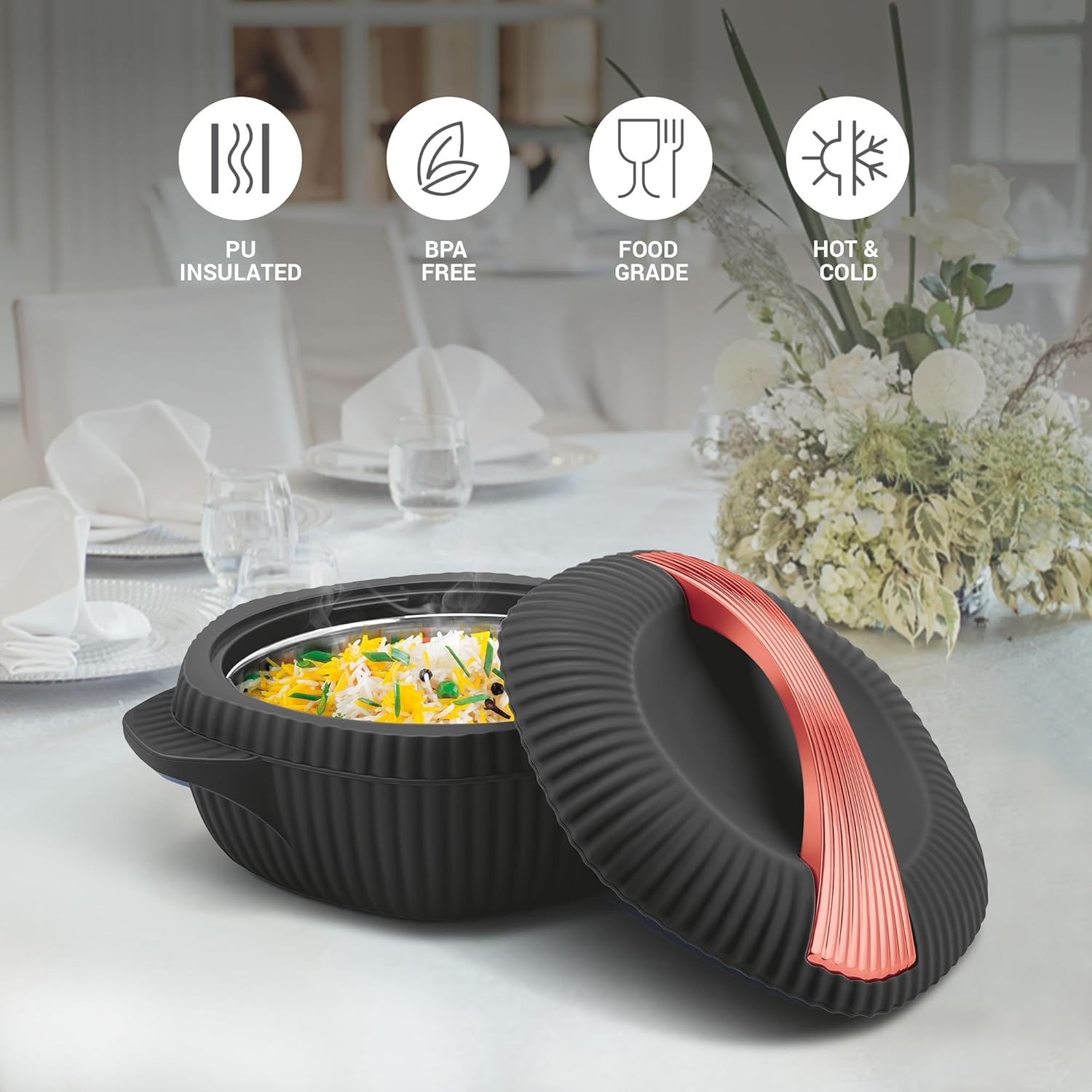 • PU Insulated Inner stainless-steel casserole keeps food hot and fresh for hours. Unique design, elegant shape and premium matt finish adds a hint of royalty to your dining and enhances your dining décorum and thus makes it a must-have casserole for your home.