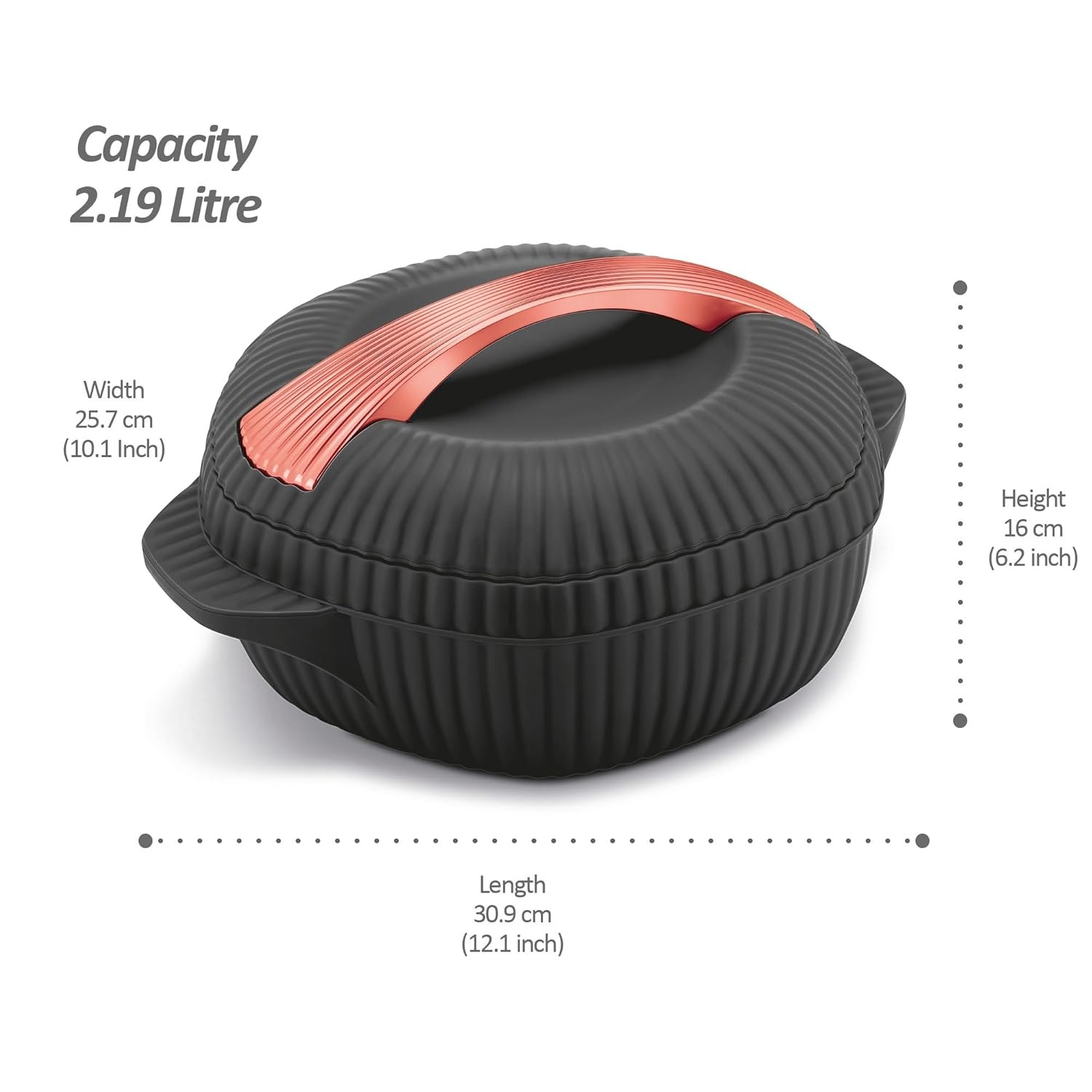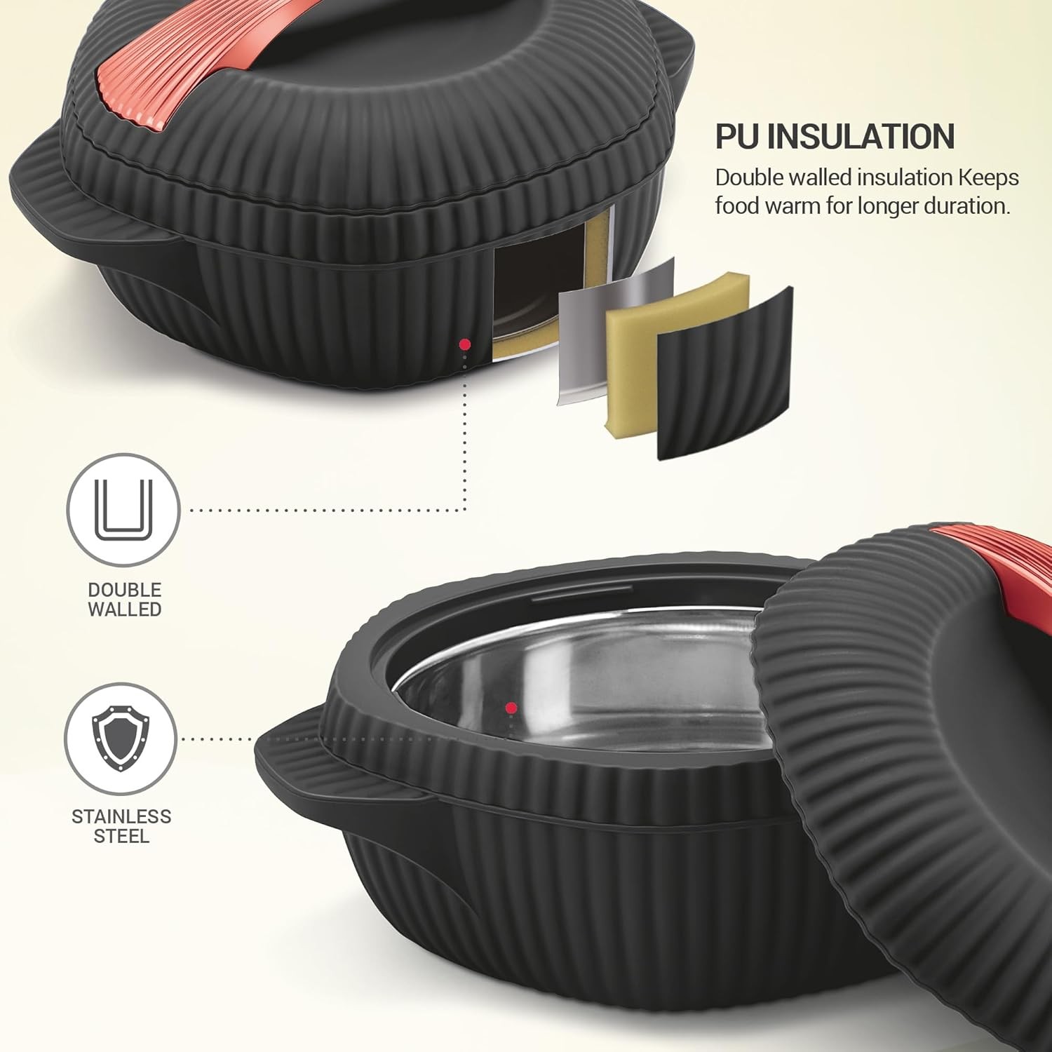 • PU Insulated Inner stainless-steel casserole keeps food hot and fresh for hours. Unique design, elegant shape and premium matt finish adds a hint of royalty to your dining and enhances your dining décorum and thus makes it a must-have casserole for your home.