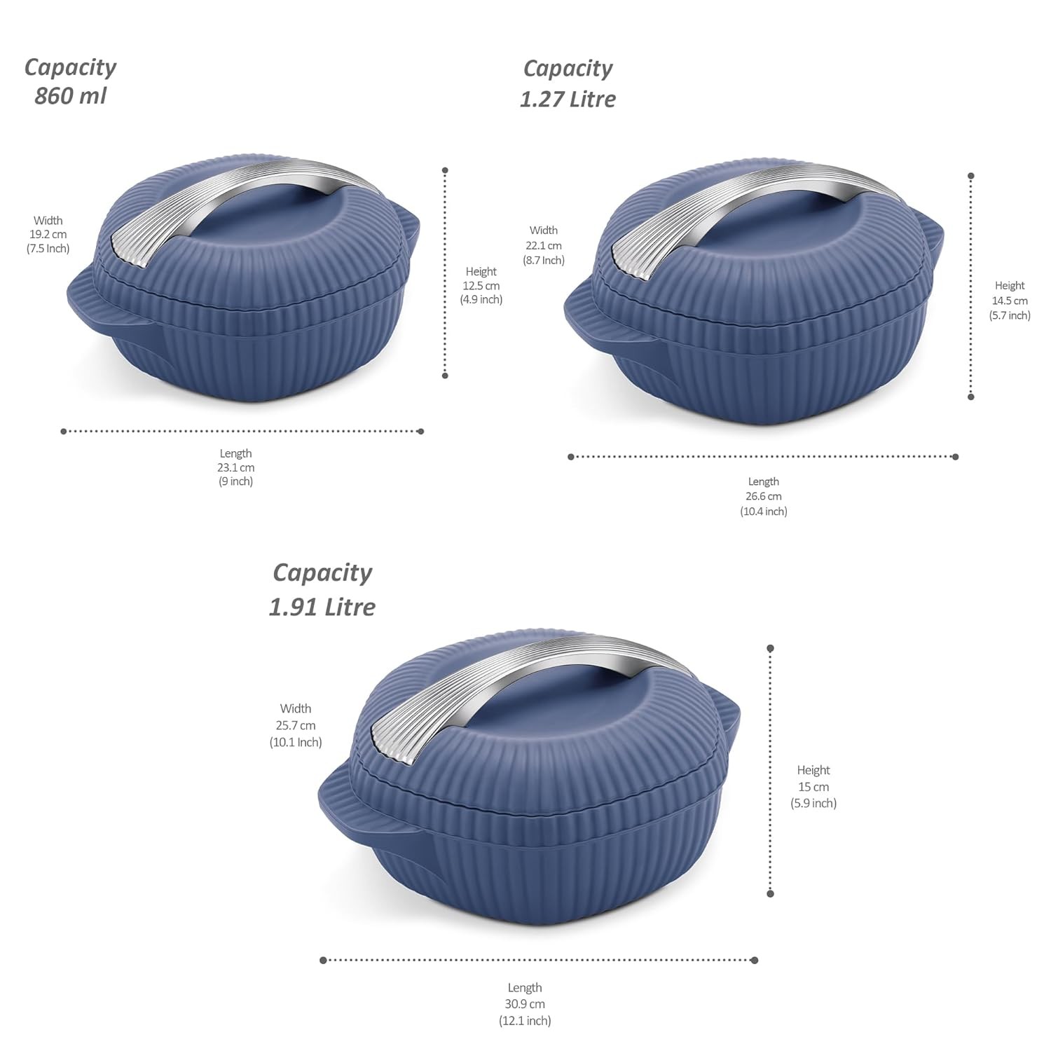 • Color: ROYAL BLUE  ; Material: Inner Steel; Outer Plastic; Package Content: 3 - pieces of Oyster Reg. Casserole (1000, 1500, 2000);Dimension in cms (L x W x H):26.7 x 26.7 x 35.5