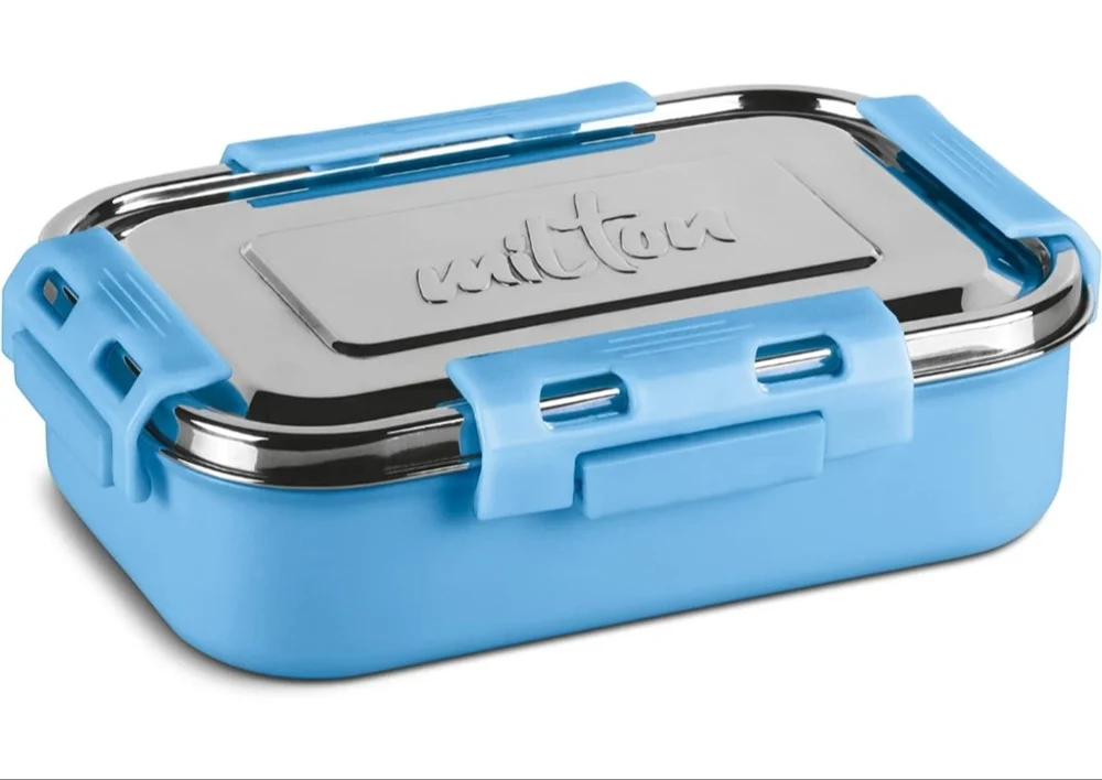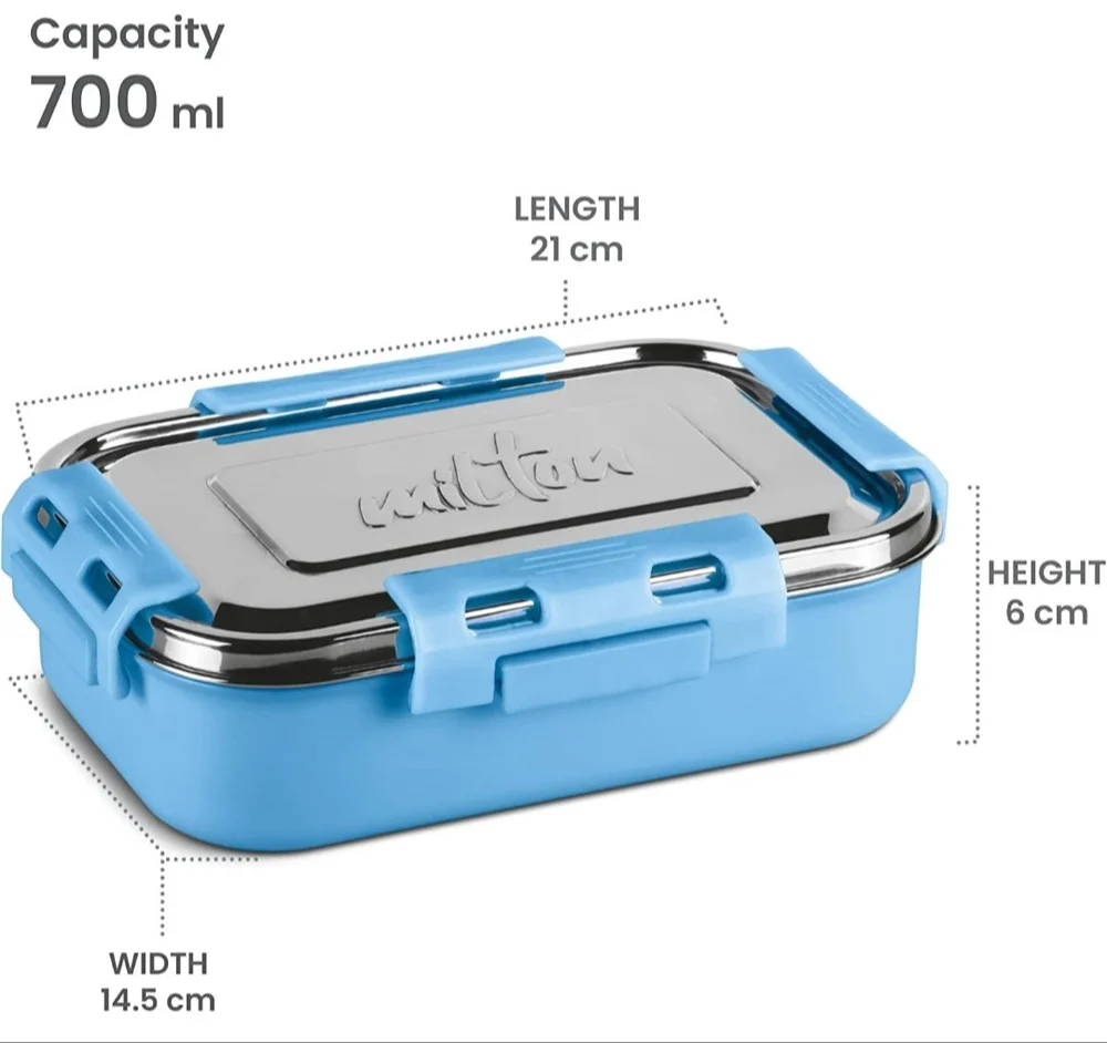 • Color: SKY Blue; Material: Inner Stainless Steel; Package Content: 1 - Piece Steel Flat Lunch Box (700 ml); Dimension in cms (L x W x H): 21 x 14.5 x 6