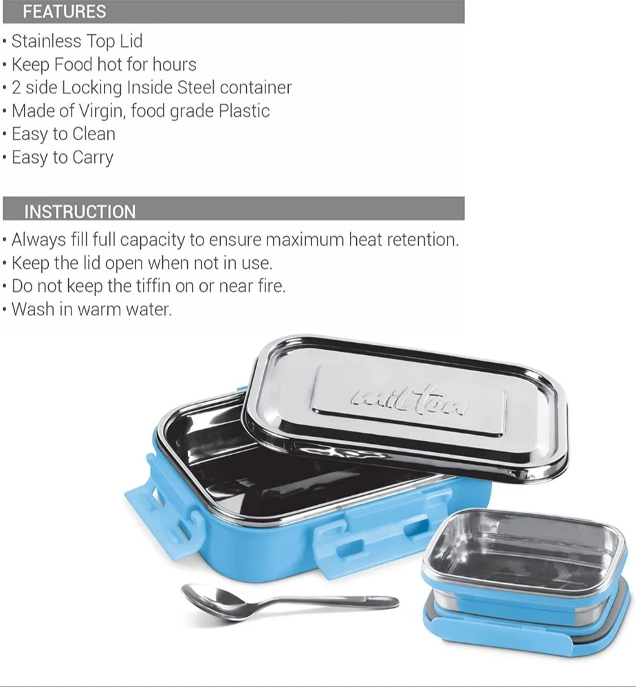 • Insulated tiffin with top steel lid and side locks, that comes with a high-quality stainless steel interior. It keeps food hot for hours.