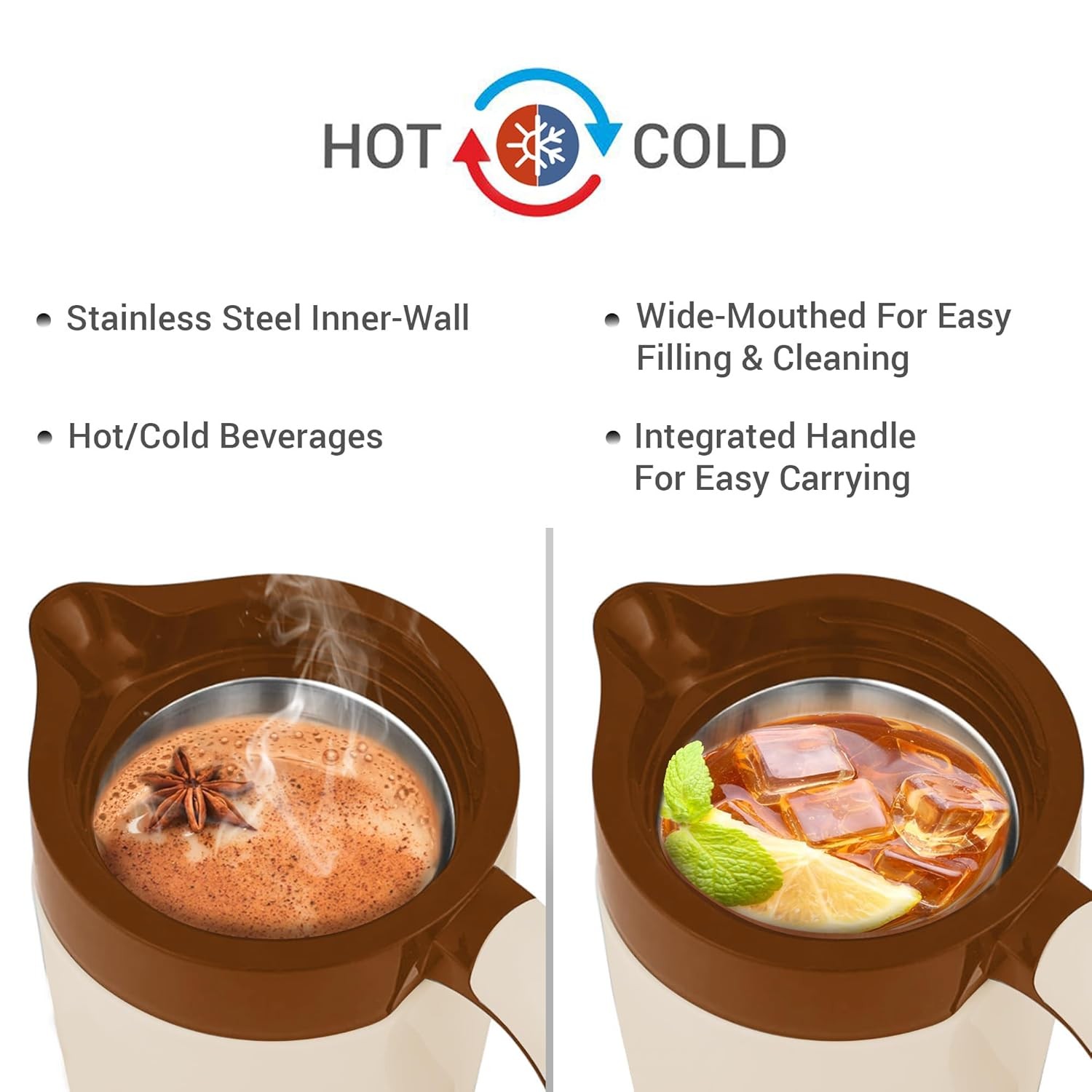 • Contemporary dual-tone finish and body-graphics, wide-mouthed for easy filling and cleaning. It is BPA free, Leak proof, odour proof and light weight. Fill the Jug upto the brim. This ensures maximum heat retention. Pre-condition Jug with hot water if using for HOT beverage and cold water if using for COLD.